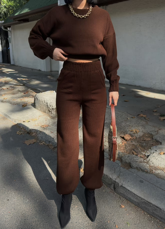 Dit bruine casual streetwear pak combineert een ontspannen pasvorm met een moderne uitstraling. De set bestaat uit een comfortabele top en een bijpassende broek, ideaal voor een moeiteloze dagelijkse look met een trendy streetwear vibe.