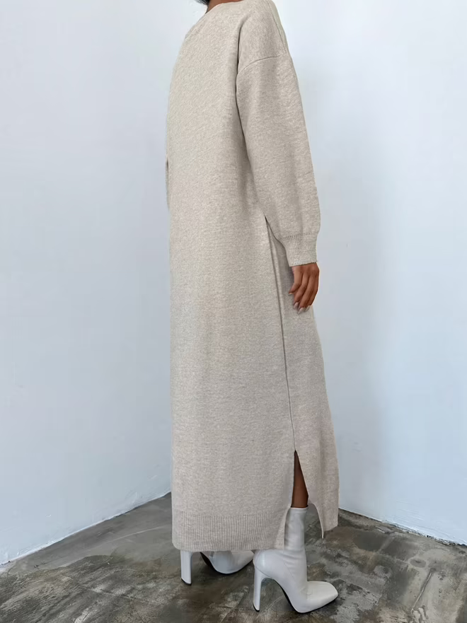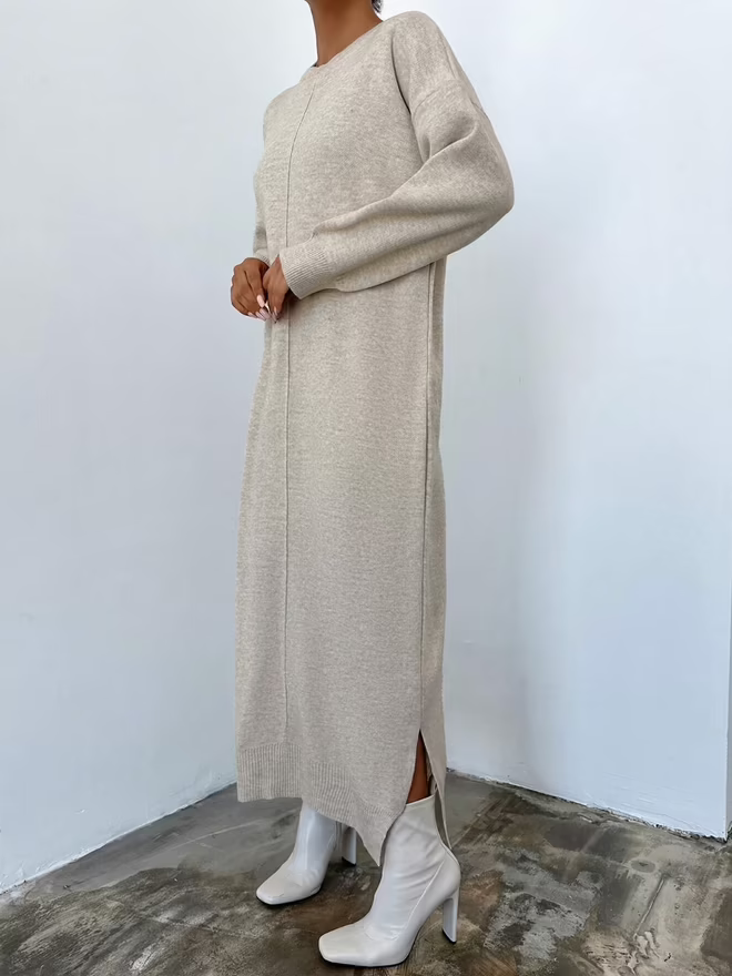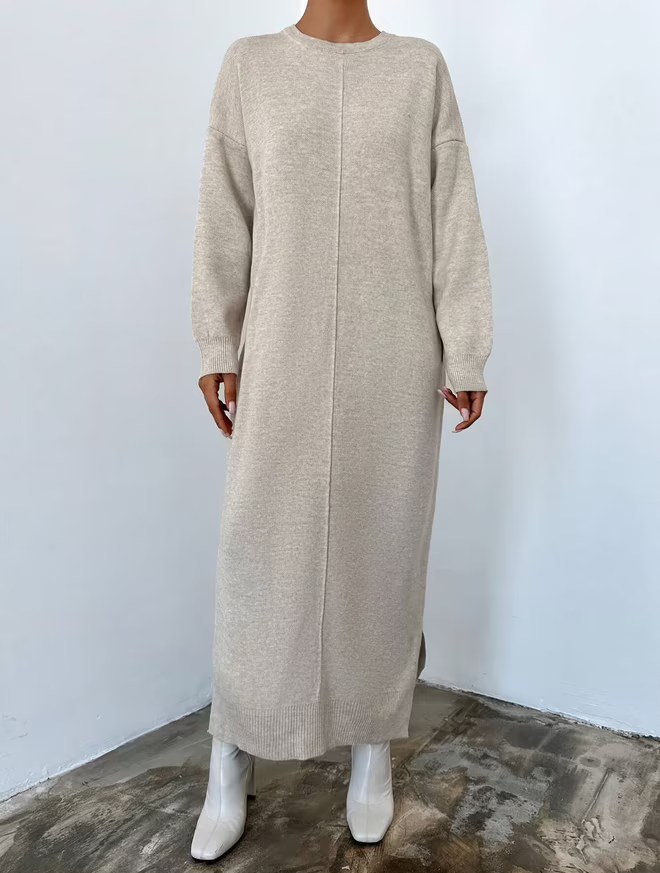 Deze steen-kleurige gebreide jurk combineert een rustige, moderne uitstraling met maximaal draagcomfort.